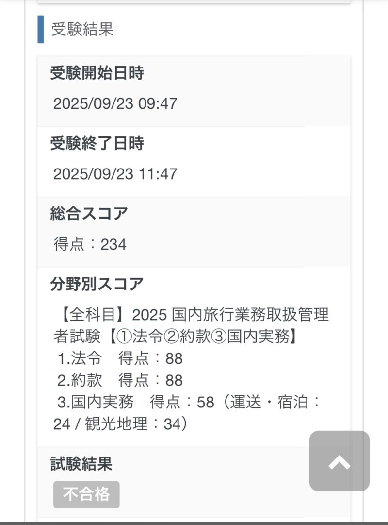 またしても不合格! しかもまた1問足りなかったんです。合格は60点以上。法令や約款がとてもできているにもかかわらず、国内実務でこんなに落としてしまい、これはショックでした…。とはいえ、勉強は1か月間だったんですけど、これは受かると思っていましたよ。