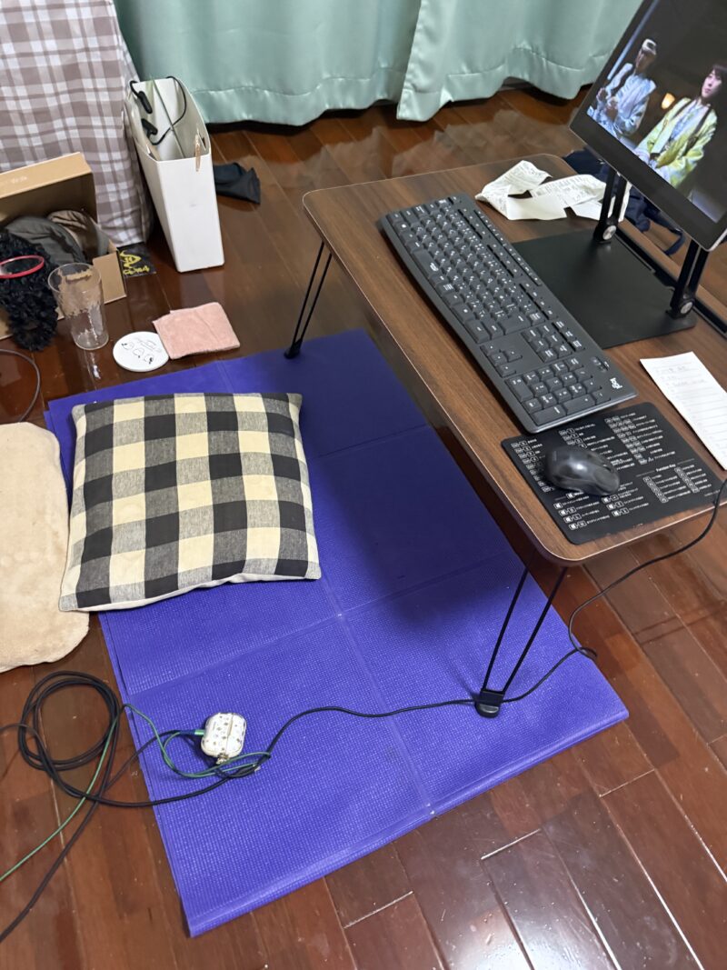フローリング生活なのはわかっていたんですが、床に座るのにラグや座布団はかさがはるので、捨てるのも大変です。こちらのヨガマットは薄く、折り畳みができるので、スーツケースに忍ばせてきました。結果、あってとっても良かったと思います。